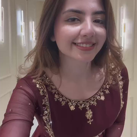 Presenting the exquisite Banarashe ethnic gown set—a perfect embodiment of traditional luxury and contemporary grace. This outfit features a rich Maroon color, beautifully enhanced with intricate golden work, making it a standout choice for any grand occasion, from festive celebrations to elegant evening events.