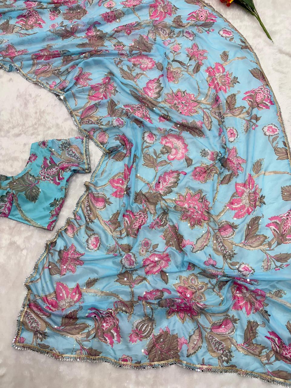 Premium Georgette Embellished With Beautiful Print , Beautiful Handwork Sequins Work , Beautiful Hand Mirror Work With Beautiful Lace*( Unstiched 1Mtr )