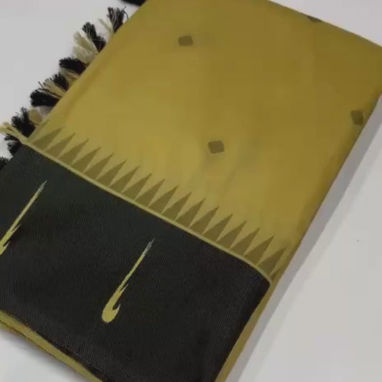Experience the timeless charm of Indian heritage with our latest Soft Silk Saree. This exquisite piece features a sophisticated dual-tone body in cream and mustard yellow, adorned with delicate woven motifs that capture the light beautifully. The highlight of this saree is the richly woven contrast Muniya border in a striking black, paired with a traditional, heavy zari-woven pallu finished with elegant tassels. Crafted for comfort and style, this saree offers a luxurious drape, making it an ideal choice for weddings, festive celebrations, and special occasions.