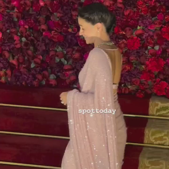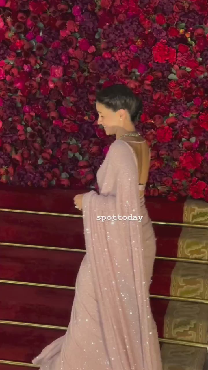 This is a stunning, heavily embroidered designer saree from the brand Banarashe, embodying the current Trending Bollywood Blockbuster Sequins Design. It is designed for a glamorous, high-fashion event such as a wedding reception or a grand party.