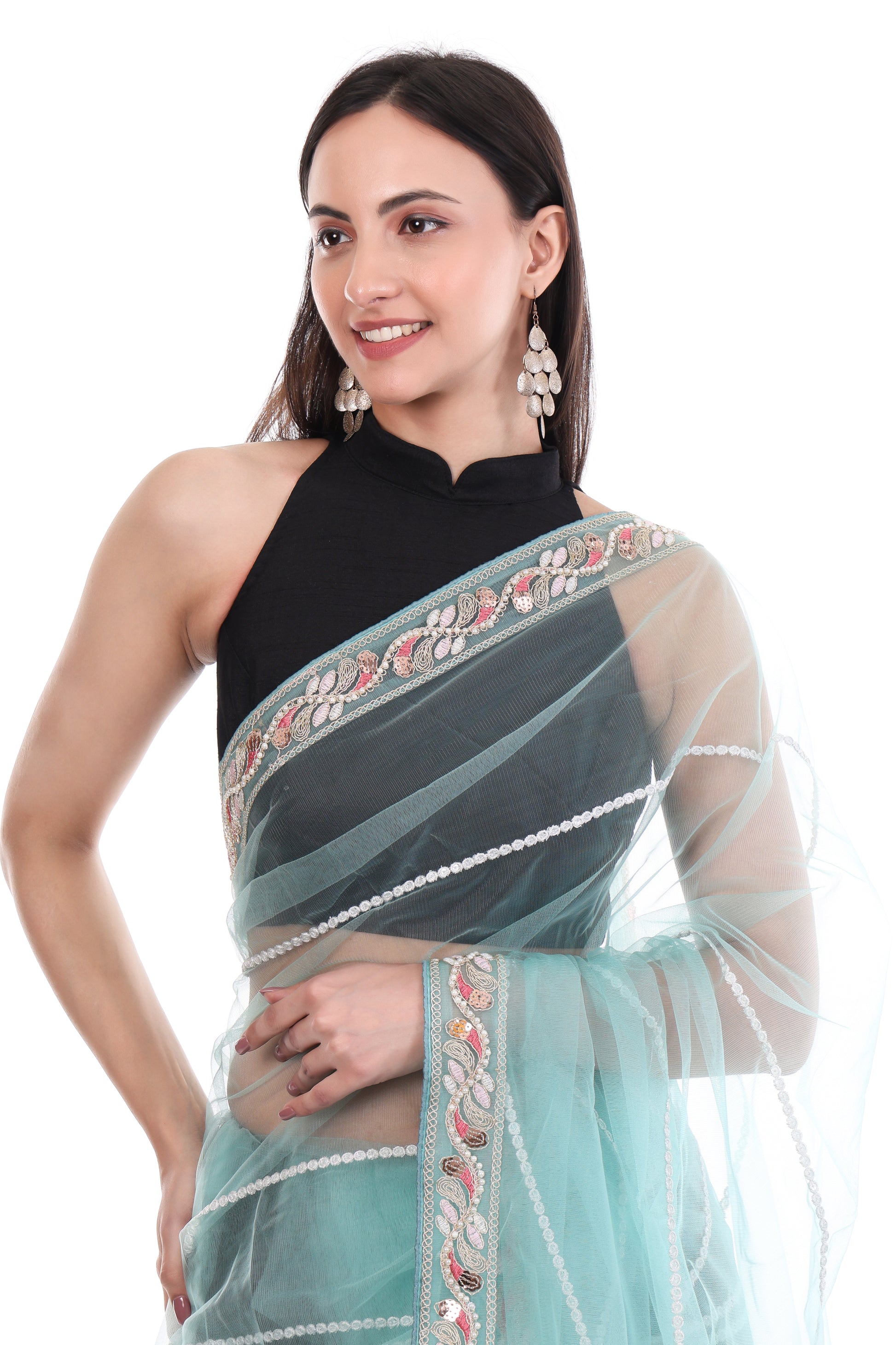 Mint Green saree set, a perfect blend of delicate fabric and heavy, luxurious craftsmanship. The saree is crafted from Premium Net, boasting intricate all-over Embroidery, Dori, and Sequin Work. The true highlight is the spectacular border, meticulously finished with a Heavy Hand Diamond Work Lace Border. The accompanying blouse piece is made from rich Premium Kasturi Silk, designed to complement the saree’s opulence. It is heavily embellished with matching Embroidery, Dori, and Sequins, along with Heavy Hand Pearl Work on both the front and back, and detailed work on the sleeves. The Unstitched blouse allows for a perfect, personalized fit. This set is ideal for Weddings, Receptions, or Festive Occasions, offering a celebrity-like look at an incredible value. Don't miss out on this designer-look piece!