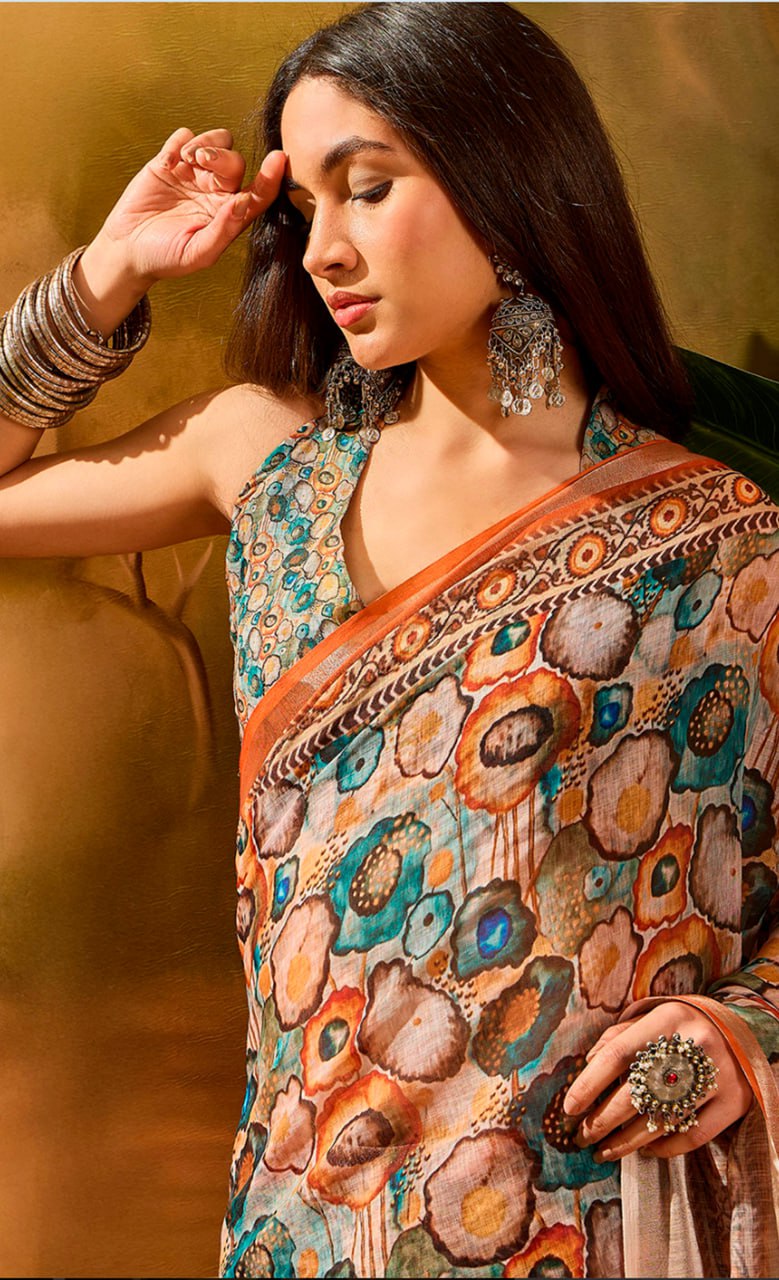 Description: Made from soft and breathable linen cotton, this saree combines everyday comfort with timeless elegance. The lightweight texture ensures an easy drape, perfect for long hours of wear without compromising style. Adorned with delicate watercolor florals over a soft teal base, it creates a graceful balance of tradition and modern charm — suitable for festive occasions, office wear, or casual outings.