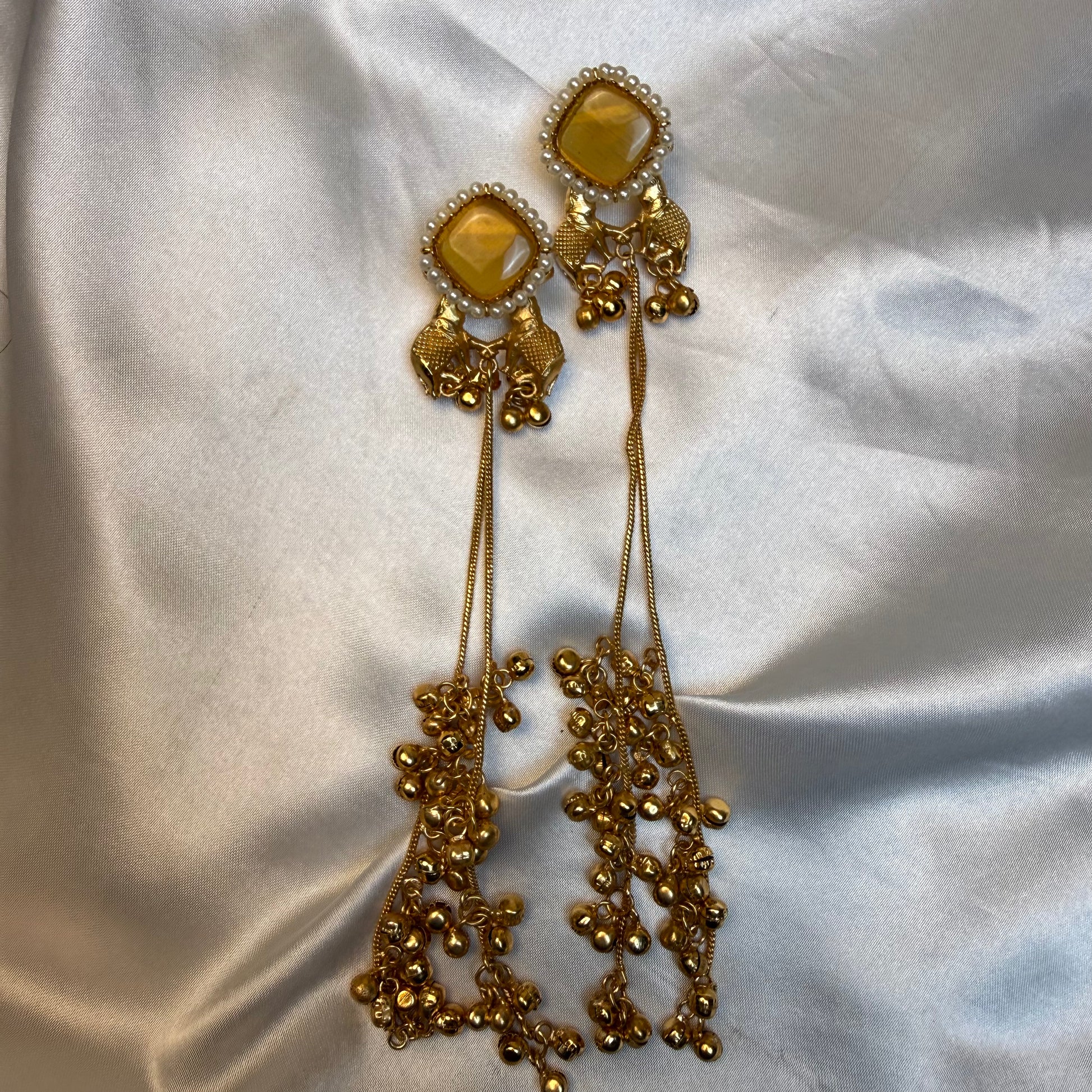 Add an elegant traditional touch to your festive look with these Premium Kashmiri Brass Long Chain Earrings, beautifully crafted to reflect timeless Kashmiri artistry. Designed with a stunning yellow stone stud surrounded by delicate pearls, these earrings feature multi-layer brass chains adorned with jingling ghungroos, creating a graceful and eye-catching movement with every step
