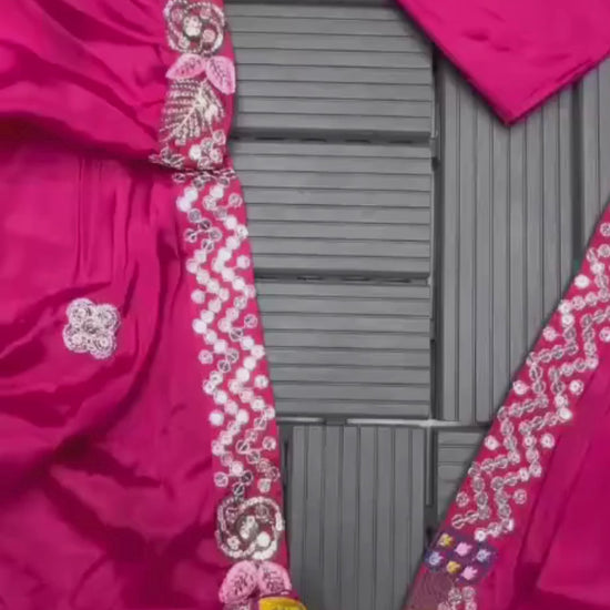 Dazzle in the spotlight with our Ready-to-Wear Rani Pink Saree Set. This ensemble is designed for the woman who isn't afraid to embrace bold, vibrant colors. Made from premium Heavy Crepe Satin, the saree offers a brilliant sheen and a seamless, graceful drape that flatters every silhouette. The set is defined by its fully-stitched matching jacket (Koti), which features dense, multi-colored floral embroidery that "pops" against the vivid magenta base. Whether it’s a Sangeet night, a mehendi ceremony, or a festive party, this "pre-draped" saree and structured blazer combination ensures you look regal and trend-forward with zero effort.