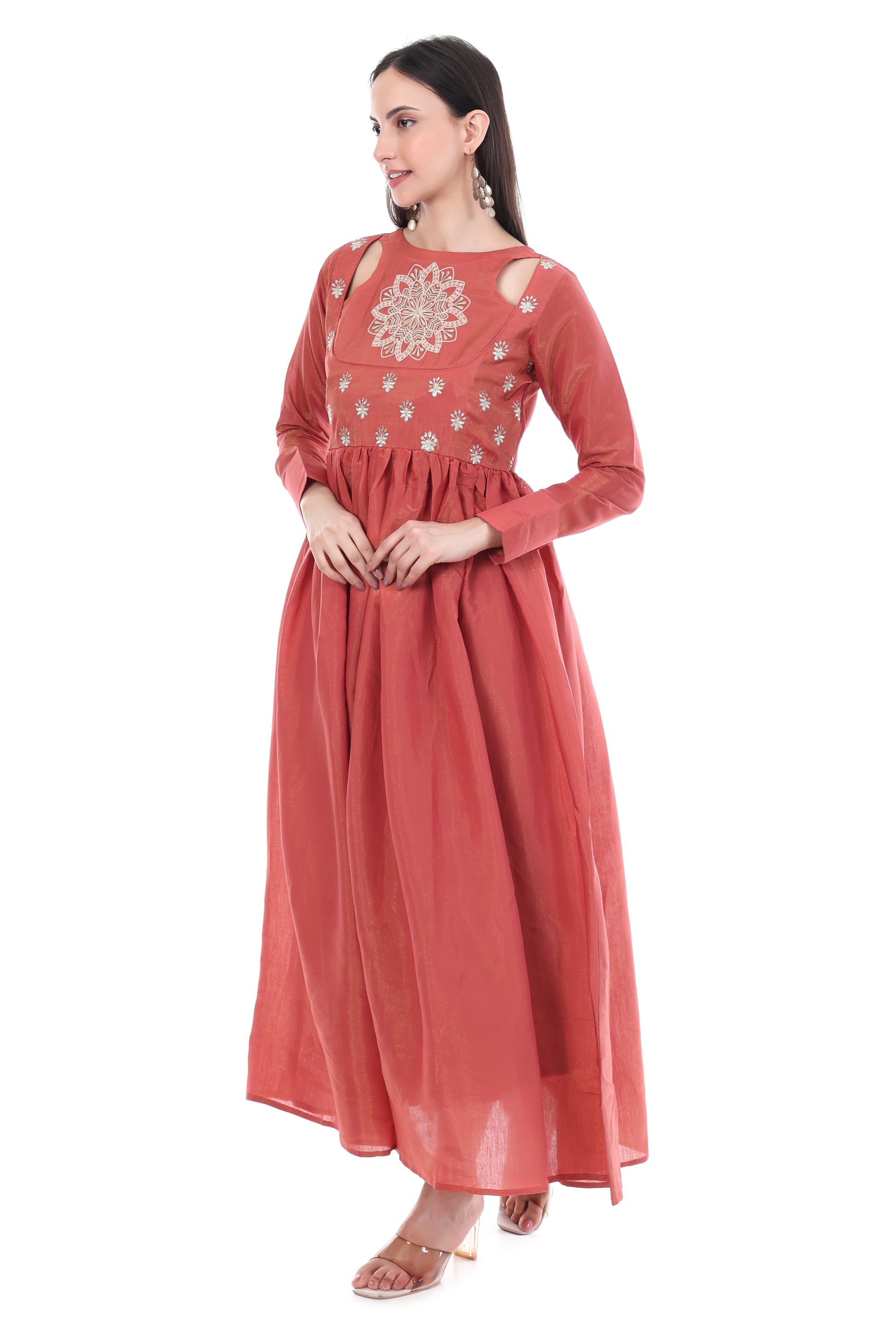 Step into timeless elegance with this premium red embroidered anarkali kurta set, crafted from soft Organza-Georgette fabric that creates a rich, flowy silhouette. The beautifully embroidered yoke with intricate floral motifs adds a touch of royalty, while the long flared design enhances your graceful charm at every step. Paired with a matching lightweight dupatta, this outfit is perfect for festive gatherings, wedding functions, and special celebrations.