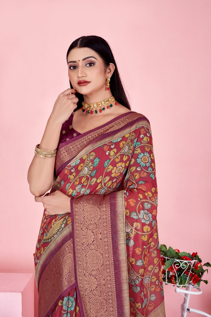 Step into royal charm with this Royal Maroon Peacock Tale Saree, featuring a rich maroon base adorned with intricate digital prints of majestic peacocks and floral motifs. The luxurious Jacquard Patta Linen Cotton fabric gives a smooth drape and elegant sheen.