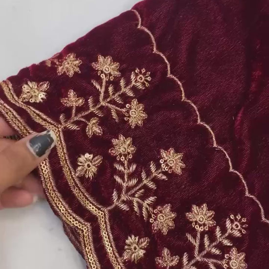 Maroon Velvet 3-Piece Suit Set is designed for luxury lovers. Crafted from Premium Velvet Fabric, this outfit showcases intricate Sequence Embroidery Work on the neckline and sleeves, giving it a royal, festive glow. The soft Micro Inner ensures comfort, warmth and all-day ease, making this the perfect choice for winter weddings, festivals, parties and special occasions. Paired with matching Velvet Pants, the outfit maintains a rich, coordinated look from top to bottom. Completing this premium set is the flowy Georgette Dupatta with a delicate Golden Lace Border, creating the perfect balance of softness and richness. This combination of velvet and georgette gives the outfit a truly timeless, regal appeal.