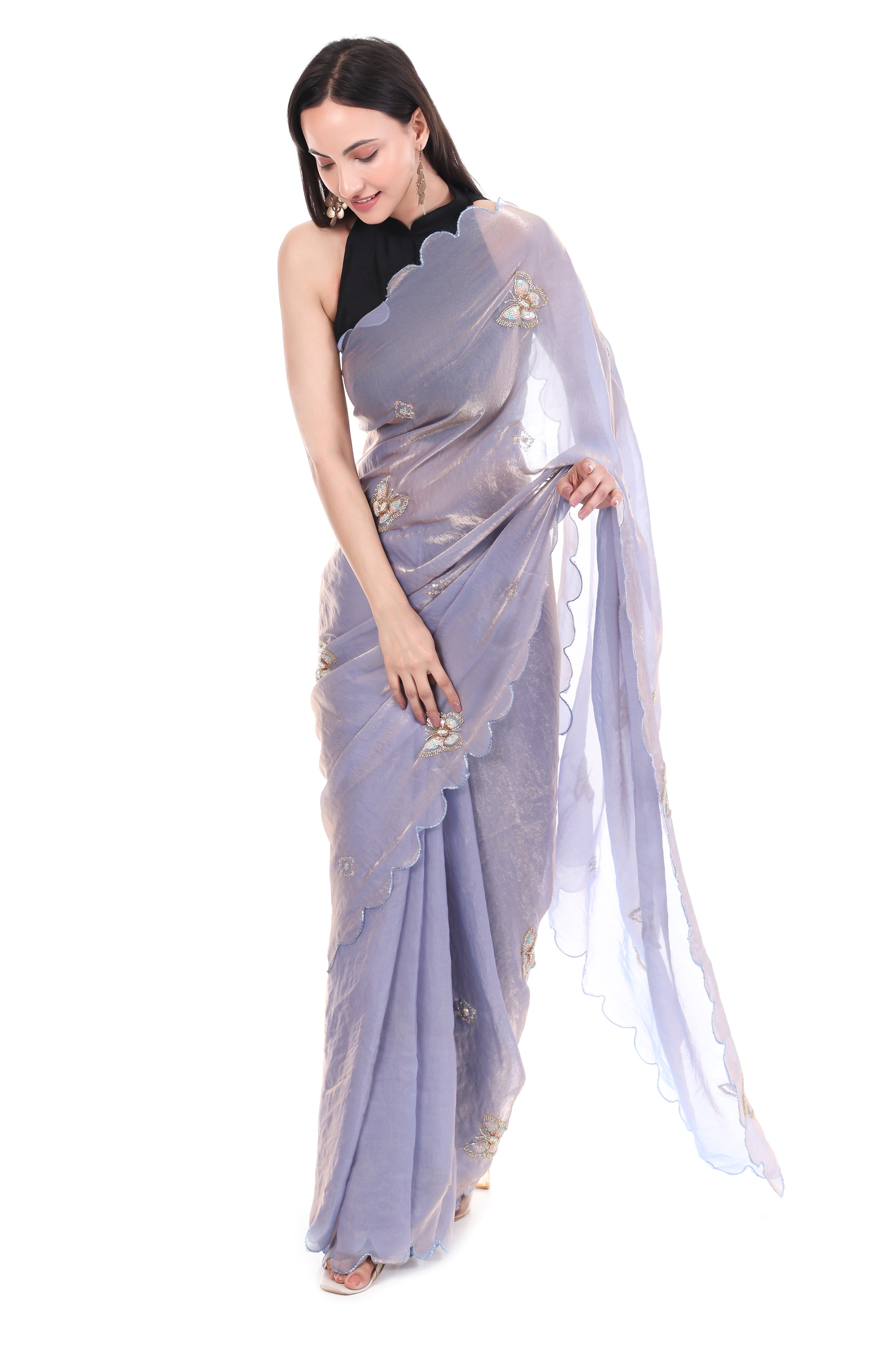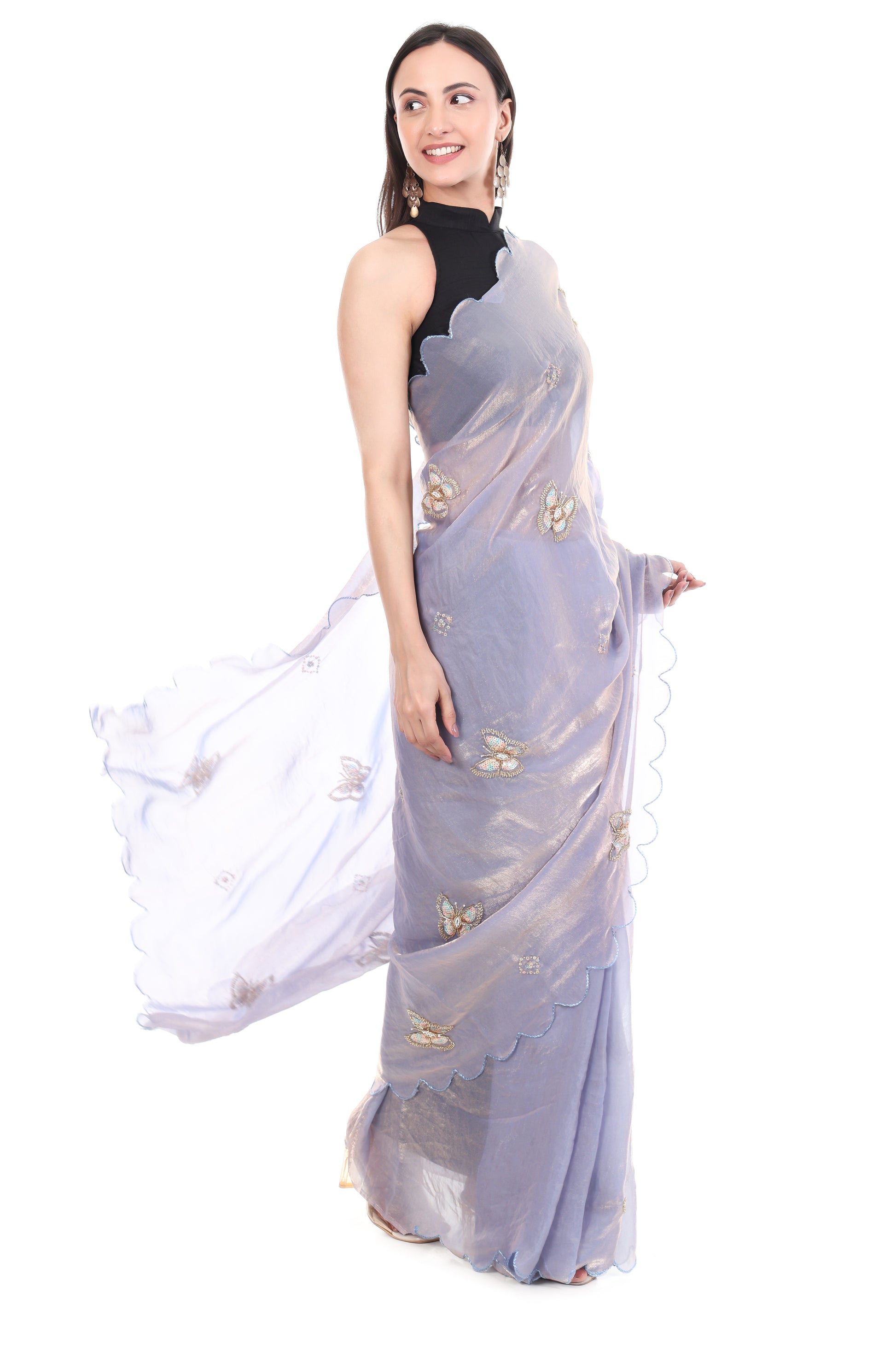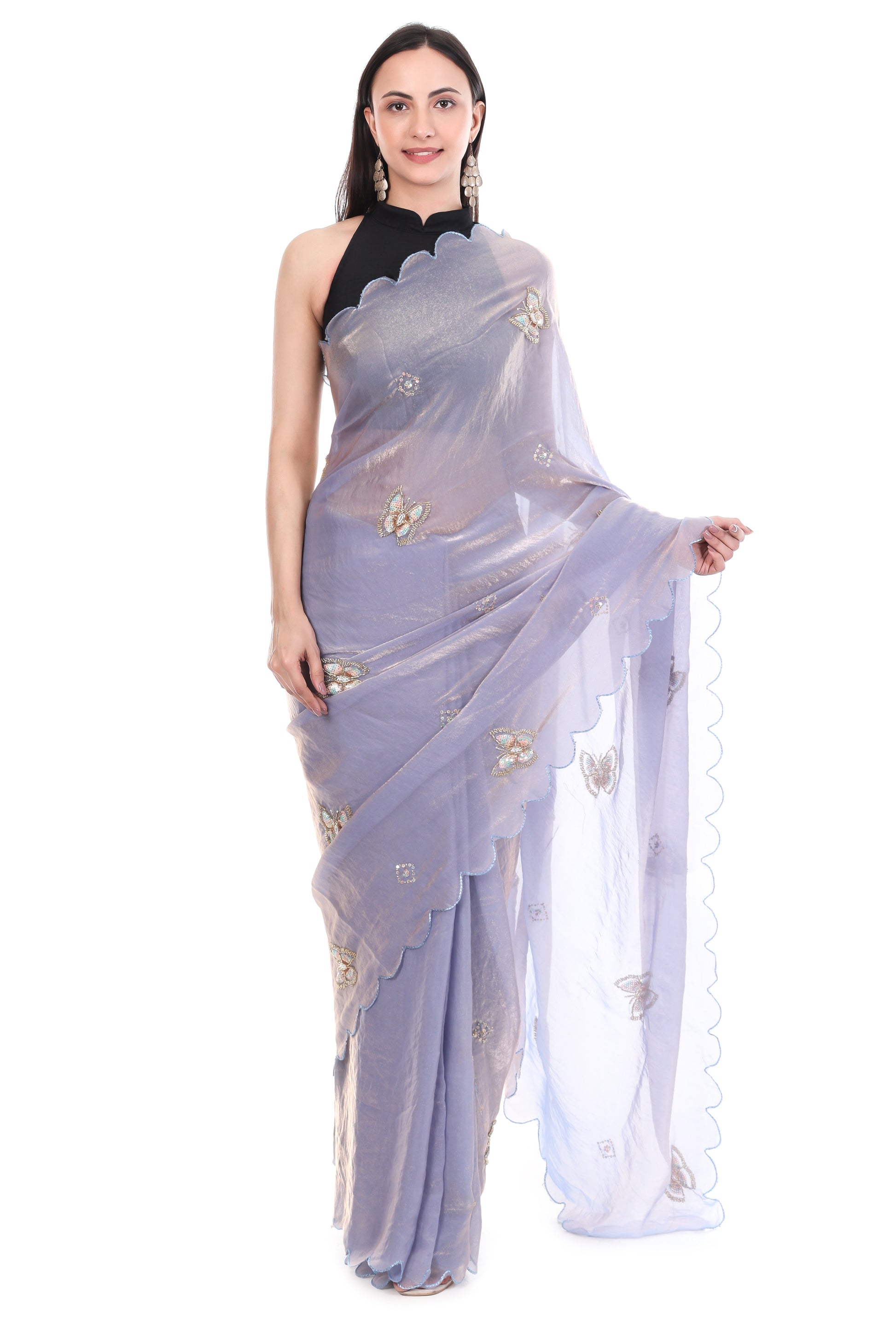 Premium Satin fabric, this saree offers an incomparable blend of luxury and comfort. The fabric’s inherent lustrous sheen and lightweight, flowy texture ensure a perfect, figure-flattering drape that moves beautifully with you. The saree’s stunning lilac hue serves as the perfect canvas for the intricate artistry. It is richly adorned with fine Khatli and Brits work, showcasing delicate Butterfly Motifs that are meticulously placed across the body. This meticulous hand-finished embroidery provides a rich texture and dazzling sparkle that catches the eye from every angle. Adding a modern, high-fashion touch is the unique All Over Arco Border. This contemporary scalloped edge offers a refreshing contrast to traditional borders, giving the saree a bespoke, designer finish. Includes a matching blouse made from the same Satin, featuring complementary detailed Brits work. Premium Quality, a perfect investment piece for weddings, engagement parties, or any grand celebration. Secure this luxurious piece and elevate your style instantly.