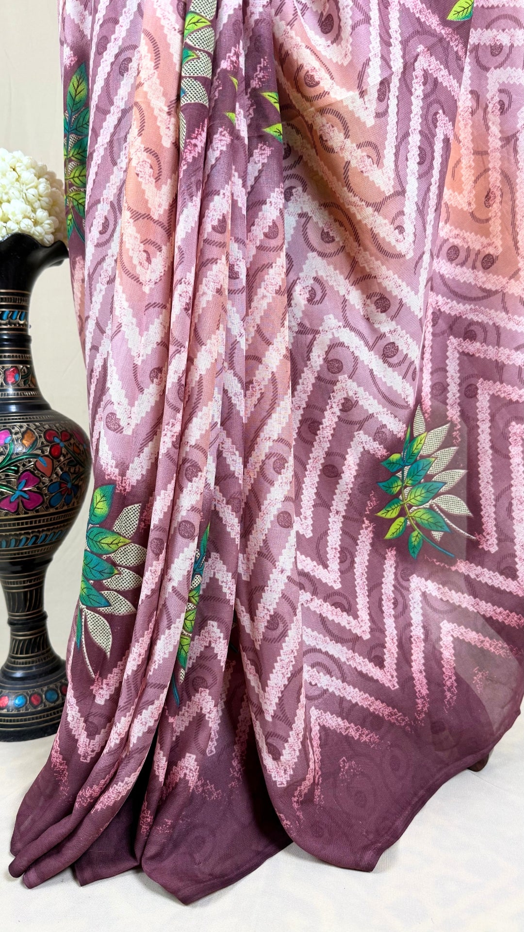 Trendy Mauve Zigzag Printed Georgette Saree with Floral Design & Blouse Piece – Lightweight Daily Wear Saree for Women